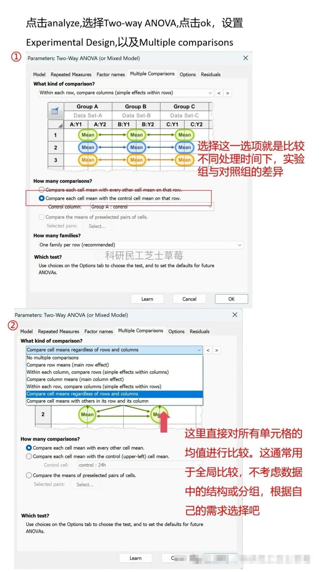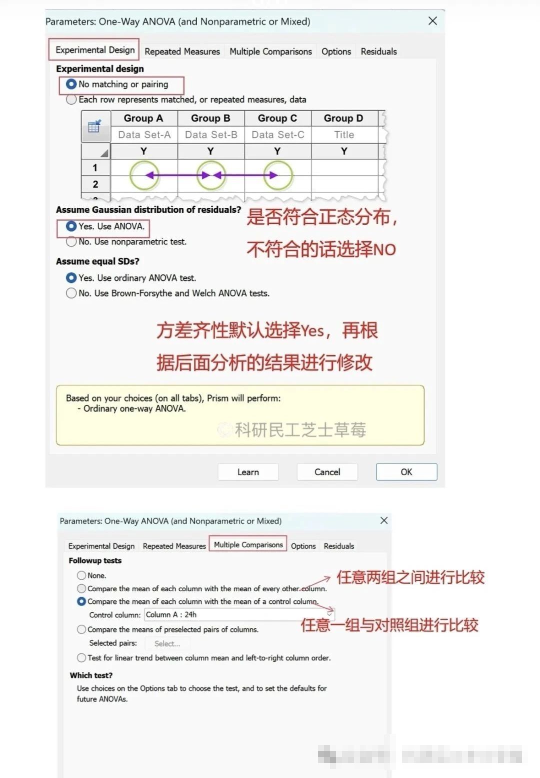 用于比较三组及以上连续数据的均值差异;分为One-way ANOVA和Two-way ANOVA