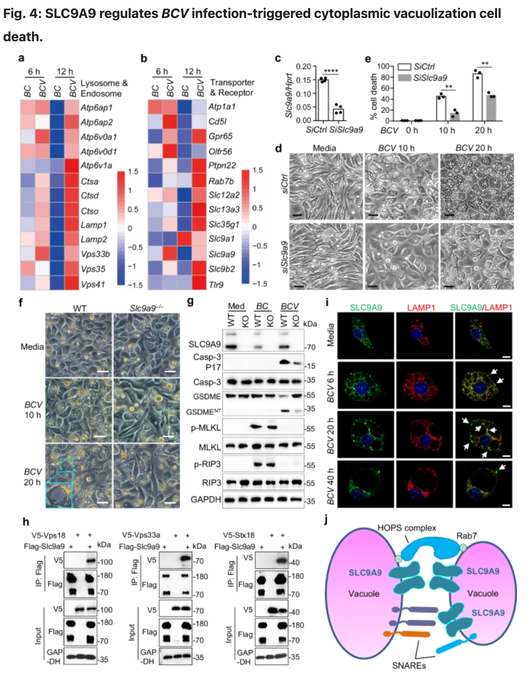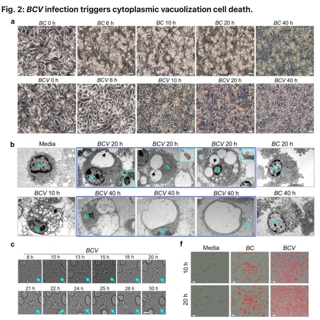 通过研究是否存在其它细胞死亡方式的标志物,团队发现BCV感染诱导了两种独立的细胞死亡途径:一种表现为细胞质空泡化,另一种是凋亡样细胞死亡。