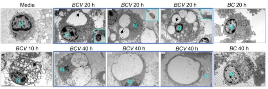 然后,团队注意到:BCV会在感染后6小时左右开始引发细胞质空泡化,在感染后10小时细胞质空泡已经非常明显,感染后20小时后细胞被单个大液泡占满。也就是我们一开始看到的现象。