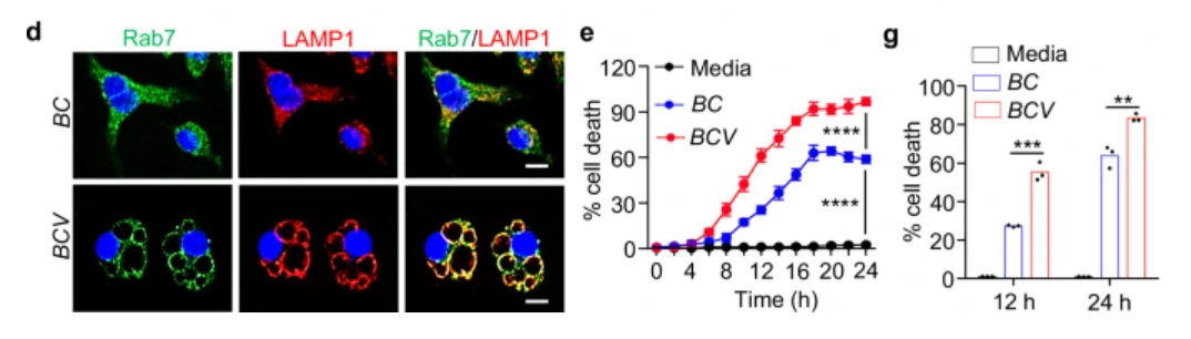当巨噬细胞感染了一种突变菌(BCV,Bergeyella cardiumVariant)后,细胞不会立刻裂开或固缩,而是发生一种独特变化:细胞质里的溶酶体与内体冒出大量空泡,像吹泡泡一样,越鼓越大。