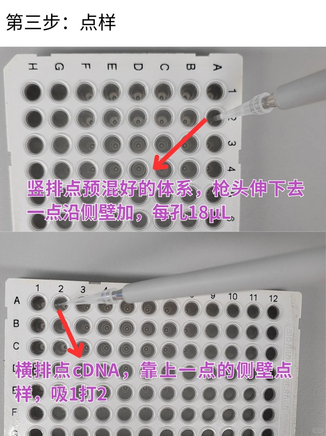 沿着竖排先加mix,将枪头伸下去一点靠管壁加入(相同的预混体系可以不换枪头);沿着横排再加cDNA,可在靠上的侧壁加样。